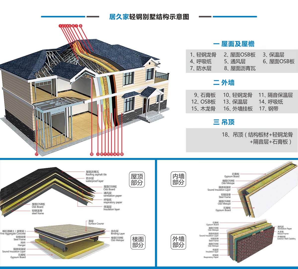 居久家輕鋼別墅隸屬于四川萬(wàn)建城建筑工程有限公司,集科研、設(shè)計(jì)、咨詢、加工、生產(chǎn)安裝為一體。一直致力于新型輕鋼結(jié)構(gòu)房屋的研究、開發(fā)和應(yīng)用,倡導(dǎo)房屋建筑的設(shè)計(jì)和應(yīng)用在標(biāo)準(zhǔn)化、模塊化、通用化、規(guī)模化生產(chǎn)的同時(shí),實(shí)現(xiàn)人居環(huán)境的個(gè)性化、人性化、以及健康和舒適。 公司目前引進(jìn)具有國(guó)內(nèi)先進(jìn)水平輕鋼結(jié)構(gòu)房屋建筑技術(shù)和生產(chǎn)線,標(biāo)準(zhǔn)化、精細(xì)化和定制化設(shè)計(jì)、制造、安裝輕鋼結(jié)構(gòu)房屋。不僅能夠提供風(fēng)格各異的別墅建筑,同樣能夠提供行業(yè)標(biāo)準(zhǔn)的輕鋼樓宇建筑及建筑群。居久家裝配式房屋技術(shù)體系是高效節(jié)能型綠色建筑體系,各項(xiàng)建筑物理性能卓越,處于業(yè)內(nèi)先進(jìn)水平,能夠?yàn)榭蛻籼峁┤棠K化綠色建筑集成解決方案。